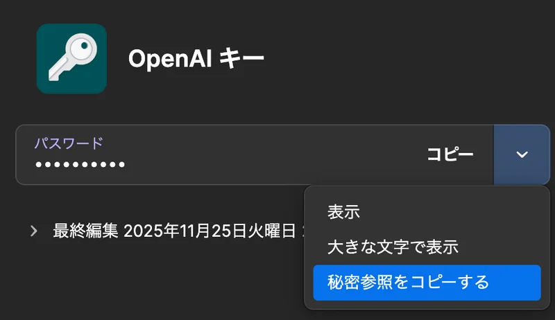 埋め込みたいアイテム(OpenAIのAPIキーを例にしましょう)のIDを特定します。 CLIからUUIDを引く方法もありますが、デスクトップアプリからやるのが個人的には楽です。 設定 > 開発者 > 「1Password CLIと統合」をONにしておくことで、アイテムから「秘密参照をコピーする」という事ができます。これを行うと