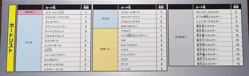 他にも、グズマ・ジャッジマン・シロナ・リーリエ・ハイパーボールのような、こういうときにいつも入っているカードも入っています。シロナだけ4枚入ってます。 ここについてきていた10パックはお世辞でもあたりとは言えないカードの引きだったので、ポケモンセンター限定セットの方であたりが出ると良いな。カスミデッキと合わせてダートじてんしゃは4枚になったので、少しデッキのまわりは早くなりそうです。 そして4/7(日)は東京のシティリーグに参加する予定です。なんのデッキにしようかな。楽しみです。