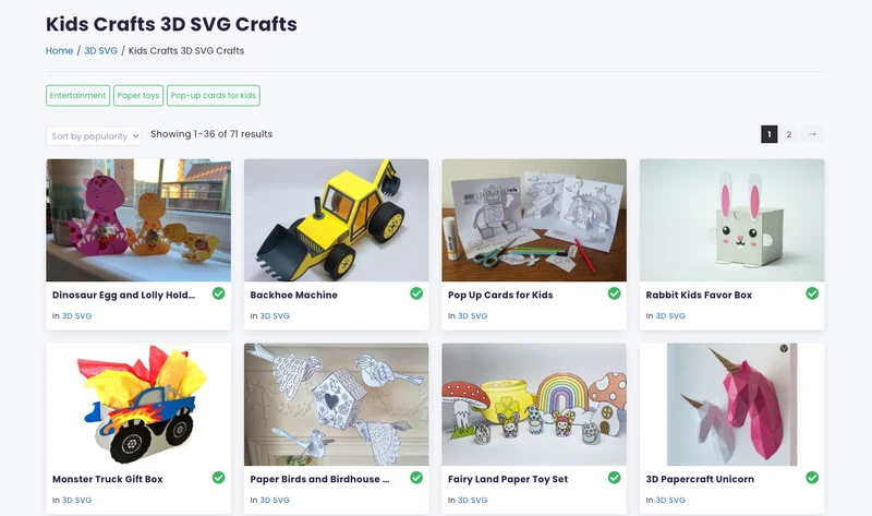 検索はジャンルが多く、目的のものがこのジャンルに該当していればかなりスムーズに探せます。とりわけ 3D Crafts 以下のジャンルにあるペーパーカットとレーザーカットの素材がよりレーザーカッターでは使いやすそうです。 タグ検索をしても商品が1つしか出てこなかったります。タグはおそらく出品者が自由につける形なのでしょうか。というか、ジャンルでうまく目的のものが見つからなければ、検索機能はちょっと弱めです。日本語も使えません。 子どもがあそべるペーパークラフトみたいなのもあって楽しそうです。こういうのを一覧で見て、なんかないかな〜みたいなことをするのはとても良いかなと思います。