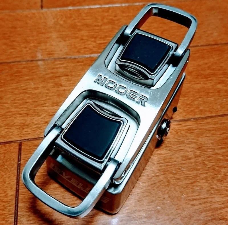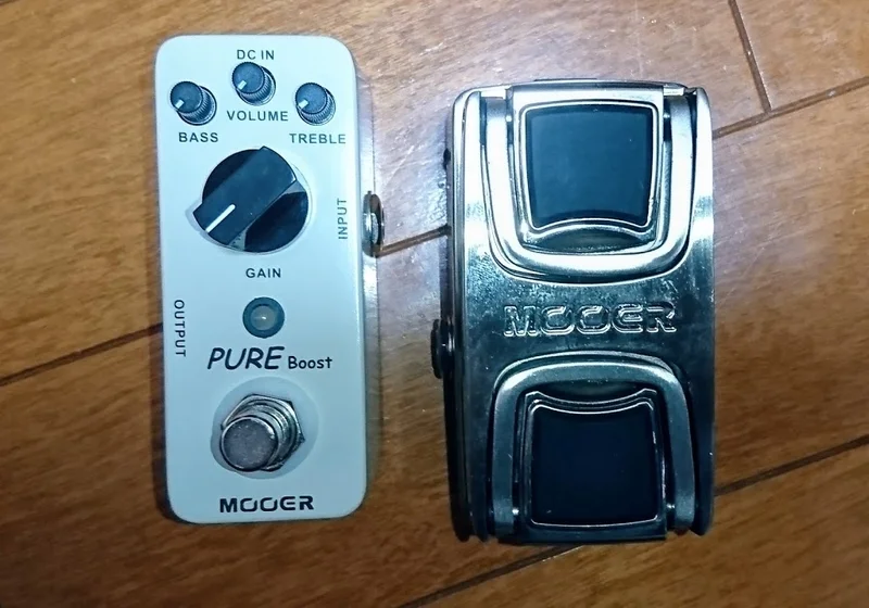 外観はこんな感じです。 なかなかに重厚で、重みも結構あります。手元のものを計測したところ、458gでした。 ボリュームペダルは足で動かすことで位置が動いてしまってはつらいので他のよりも重めになっているのかな。小型エフェクターは軽いものが多いですからね、昨今。 mooerのPure boostと並べてみるとこんな感じです。