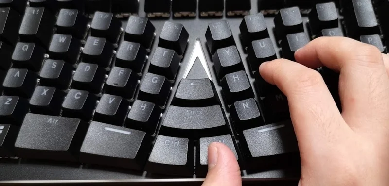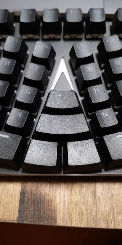 ざっくり言葉でまとめると、格子状キーボードを人間の手に作りに合わせて内側に婉曲させ、空いたスペースによく使う便利なキーを置いた。みたいなキーボードです。